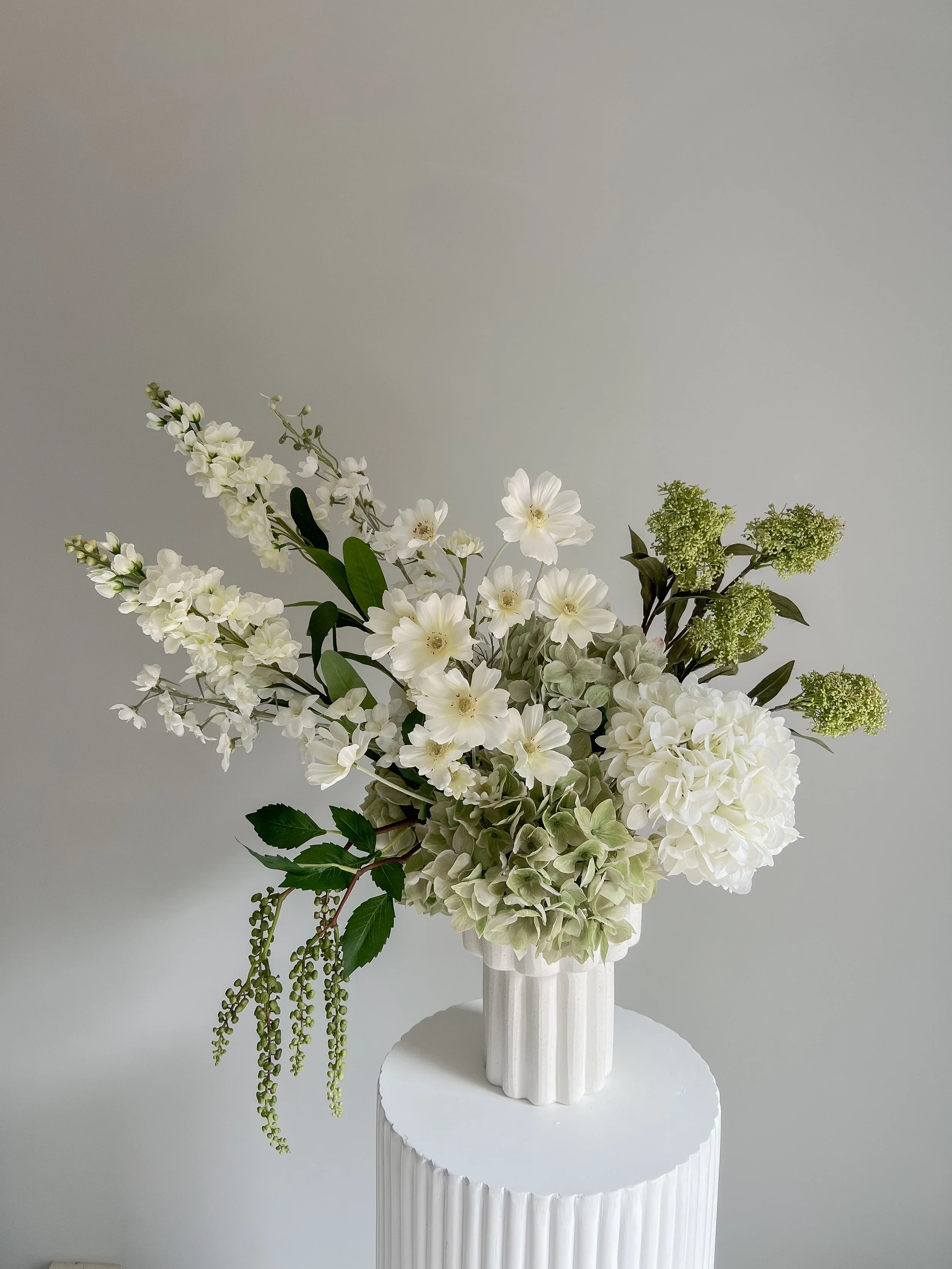 Style: Sculptural ivory and sage. Airy asymmetry in a fluted pedestal.